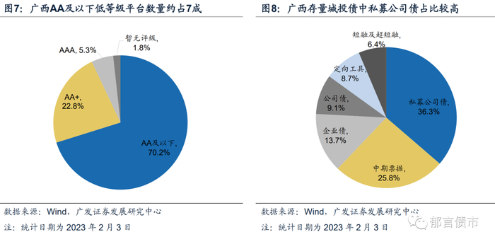 截至2023年2月3日,广西城投债余额为2399.3亿元,涉及发行人57家。从发行人主体评级来看,AA及以下平台共40家,约占7成;AAA和AA+平台分别为3家和13家,占比分别为5.3%和22.8%。从债券类型来看,私募公司债余额最大,为871.3亿元,占比36.3%;中票次之,为619.4亿元,占比25.8%。