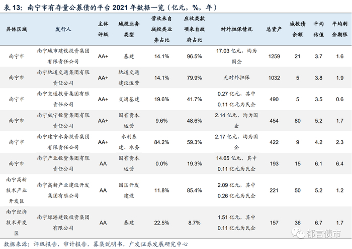 平台概况方面,南宁共有9家存量债平台,其中市级平台6家,国家级园区平台2家,其他园区平台1家。6家市级平台大致可以分为基建、水务、交通、国有资本运营4类,其中基建类平台1家,水务类平台1家,交通类平台2家,国有资本运营类平台2家。