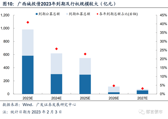 广西城投债2023年到期及行权规模较大,为981.6亿元,占存量债余额的40.9%。2024年规模下降至618.6亿元,2025年进一步减少至547.4亿元。