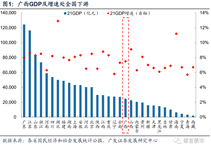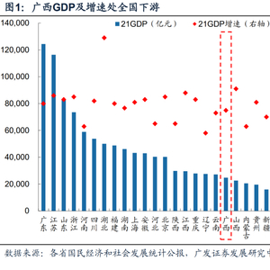 广西壮族自治区(以下简称“广西”)经济实力处全国中下游水平。2021年GDP为24741亿元,排全国第19位;GDP增速为7.5%,排全国第17位;人均GDP为49206元/人,仅高于黑龙江和甘肃,排全国第29位。