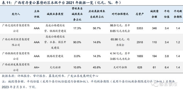 从职能划分来看,区本级5家存量债平台大致可以划分为交通、文旅和国有资本运营三类。交通类平台有3家,分别为桂交投、北部湾投资和桂铁投,桂铁投为桂交投子公司。桂交投和北部湾投资主要负责广西高速公路投资建设运营,截至2022年3月底,两者运营收费公路总里程分别为4794.24公里和1170.19公里,合计约占广西收费高速公路总里程的8成。桂铁投主要负责广西铁路投资建设,还开展大宗物资供应及物流、房地产开发、锰矿采选冶炼及供应等经营性业务。文旅类平台为桂旅游,主要负责广西旅游项目的投资建设和运营,经营三江程阳八寨、贺州紫云洞等多个景区,其子公司广西城建投资集团是广西棚改的“统贷统还”主体。公司存量债平均估值较高,为6.4%。国有资本运营类平台为桂农投,业务涵盖发电、水利投资及运营、糖业和农业等板块,目前仅存续一只2022年6月发行的私募公司债。