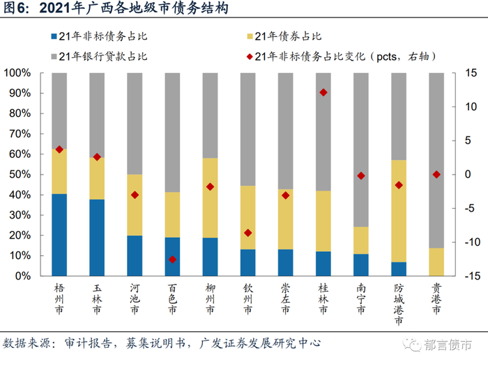 从非标占比变化来看,2021年广西多数地级市城投非标占比下降。其中百色降幅最大,超过10个百分点,主要因为有息债务增长同时非标债务规模下降,钦州、崇左、河池降幅亦在3个百分点以上。