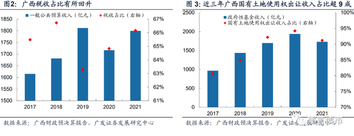 财政方面,税收占比有所回升。2021年广西一般公共预算收入为1800亿元,排全国第23位,增速为4.8%,排全国第28位;税收收入占比为66.2%,排全国第26位,较2020年提升1.3个百分点。政府性基金收入为1729亿元,较2020年下滑10.8%,其中国有土地使用权出让收入为1577亿元,占比91.2%。