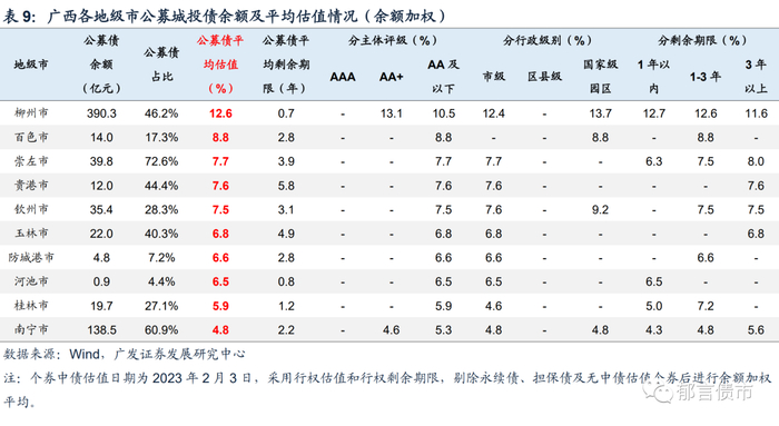 从私募城投债平均估值来看,柳州仍是最高,为12.4%,来宾、百色、崇左和钦州次之,介于8.0%-9.0%。而后是梧州、防城港、贵港、河池,平均估值在7.0%-8.0%。而玉林、桂林、南宁相对较低,介于5.9%-7.0%。