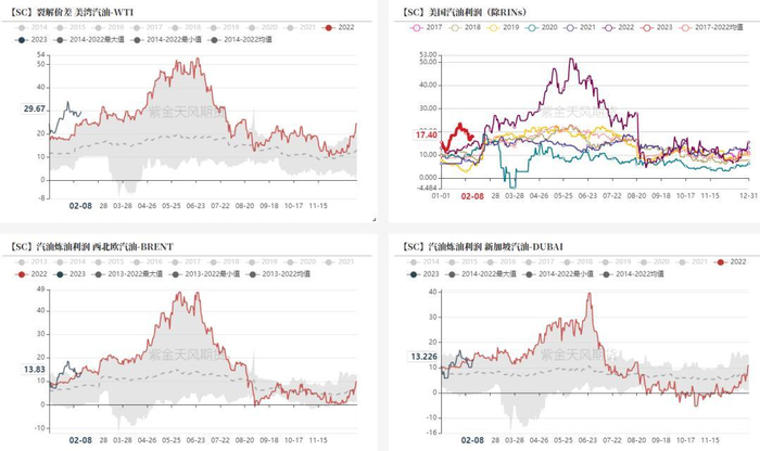 截至2月8日,WTI近次月价差收于-0.22美元/桶,2-3价差为-0.15美元/桶;Brt近次月涨至0.39美元/桶,2-3价差收于0.54美元/桶;SC近次月价差收于-5.1元/桶。