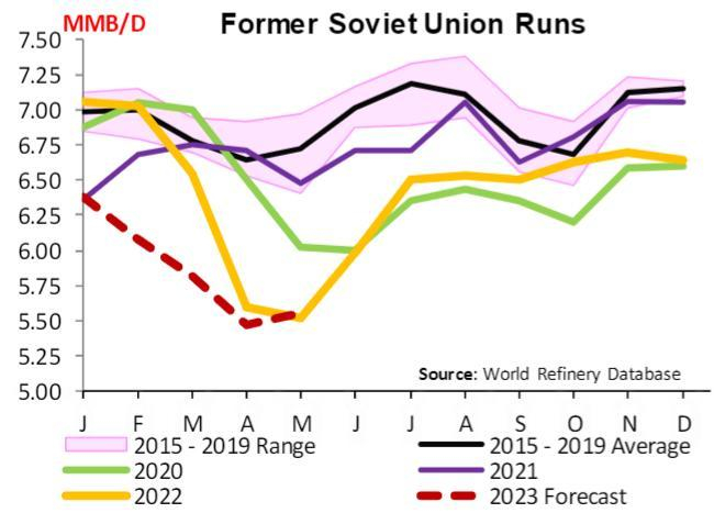 预计俄罗斯炼厂开工将进一步下滑,进料需求将由630降至最低550左右,降幅达到80万桶日。