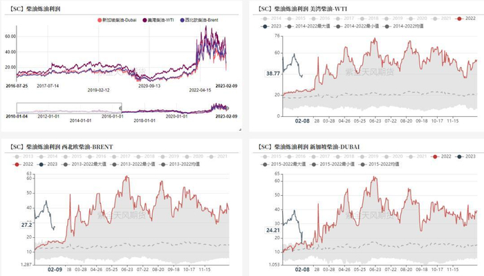 基本面情况:近两周现货升贴水自低位反弹,更多的是来自供应端的冲击,而需求修复的路径更长,现货市场有回暖迹象,需继续观察。但近端俄油的出口冲击仍在继续,1月对亚出口的环比增量超过50万桶日,对欧出口量级维持在150万桶日左右,使得整体船运量继续回升,近端整体现货宽松,1月全球库存回升。