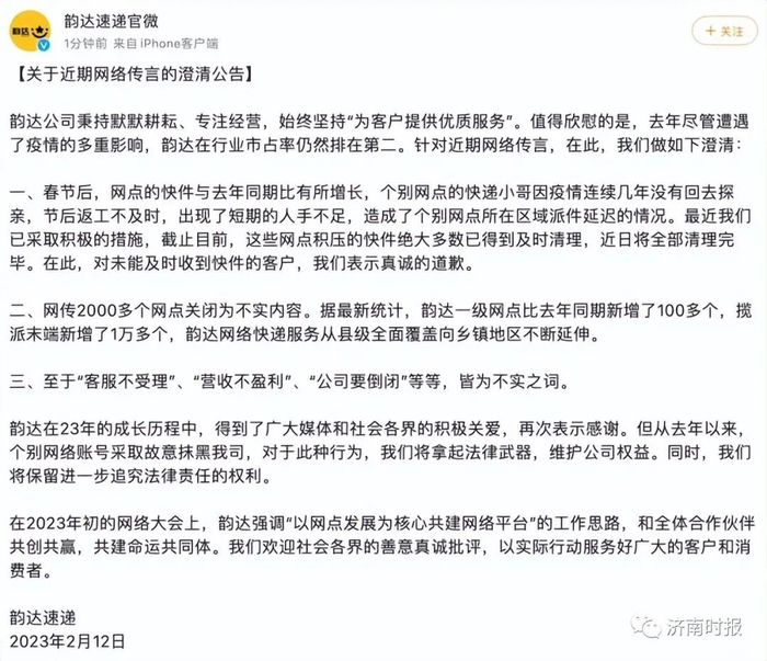 昨天(2月12日),韵达速递官微发布澄清公告,针对近期网络传言作如下澄清: