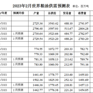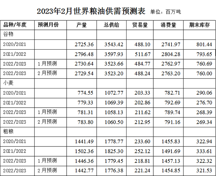 美国农业部2023年2月粮油供需预测报告