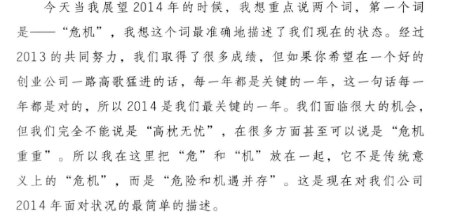 美团开辟新的业务增长点的意愿也非常迫切,干嘉伟提到:“美团的团购业务已经有一两亿用户和几百万商家,但团购对于商家、对消费者的价值都在钝化,比如面对折扣大家已不再像之前那样兴奋,因此,我们需要寻找第二曲线。” 王兴在2013年年会讲话中,用“危”和“机”来面对接下来的2014年: