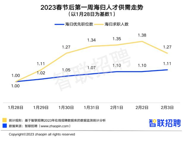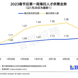 平台数据显示,2023年春节后第一周,海归优先的职位数和在国内求职的海归人数均呈上扬态势,2月3日的海归优先职位数比1月28日增长11%,海归求职人数增长27%。