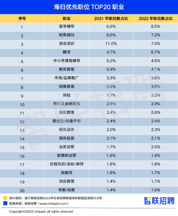 从职业来看,2022年海归优先职位占比较高的是留学辅导、语言培训、翻译等专业化岗位,占比均超过6%。招聘需求占比前20的职业还包括销售顾问、市场/品牌推广、保险、银行及金融服务等市场类及金融类岗位。值得关注的是,幼儿外语教育在国内的风靡也带动海归优先职位招聘需求,中小学课程辅导、早教/幼教职业均进入招聘需求TOP 20。从占比增幅来看,留学辅导、翻译等留学类、语言类岗位均有较大增长。