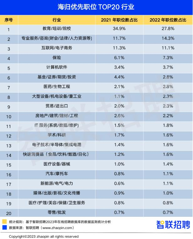 专业服务、生物医药、装备制造行业对海归招聘需求扩大