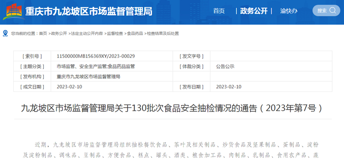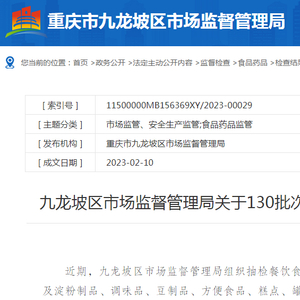 中国质量新闻网 近日,重庆市九龙坡区市场监督管理局发布关于130批次食品安全抽检情况的通告(2023年第7号)。