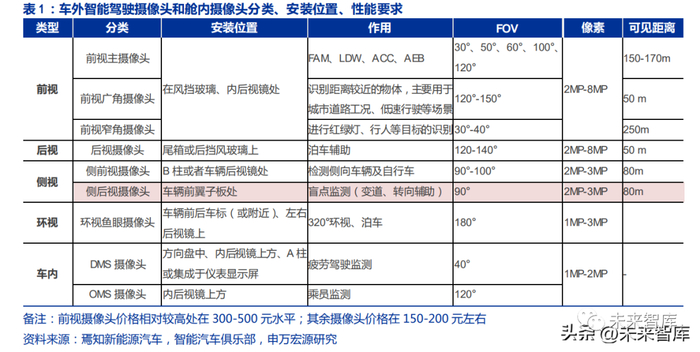 3、减少摄像头数量(可行,可以复用 ADAS 侧后视摄像头降低成本)。ADAS 系统 所用到的摄像头分为用于行车系统的前视和侧视摄像头(侧视包括 2 颗侧前视摄像头和 2 颗侧后视摄像头),以及用于 360°环视和泊车的环视鱼眼摄像头、后视摄像头。ADAS 系 统用的侧前视摄像头目前通常安装在左右后视镜处或下方车身处;侧后视摄像头安装在前 翼子板处;左右侧环视摄像头安装在左右后视镜上。环视摄像头和侧后视摄像头是可以看 到侧后方的,和 CMS 摄像头看到的视野有一定重合,我们分别来分析:(1)环视摄像头 不可以替代 CMS 摄像头:从 FOV 和拍摄角度而言,用左右两侧环视摄像头做为 CMS 摄 像头是不合适的,因为拍摄区域不一样,环视鱼眼摄像头 FOV 一般是 180°,而 CMS 摄像 头 FOV 是 70°,一旦 FOV 大了以后会涉及到图像裁剪和畸变的问题。(2)CMS 摄像头 可以复用侧后视摄像头:侧后视摄像头拍摄角度和观察视野区域其实和 CMS 摄像头是一致 的,都是侧后方,而且侧后视摄像头 FOV 一般是 90°,和 CMS 摄像头 70°FOV 接近,不 会产生明显畸变问题;另一方面,CMS 摄像头一般是 200-300 万像素,和侧视摄像头一 样,目前也有厂商开始尝试用 400-500 万像素作为 CMS 摄像头,由于乘用车 CMS 显示 屏是 7 英寸,因此如果用 800 万像素摄像头作为 CMS 摄像头会比较浪费。另外由于 CMS系统对延时性要求比较高,因此要求 CMS 摄像头至少为 60 帧,只要侧后视摄像头也达到 这个帧率要求即可。