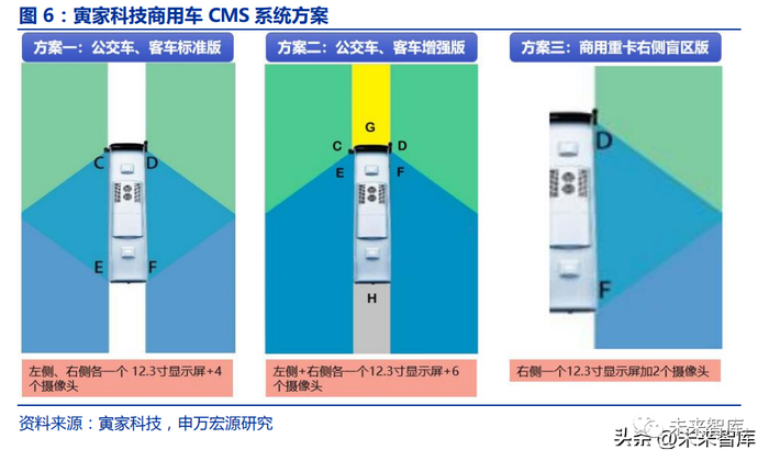 商用车和乘用车 CMS 系统都是由摄像头、显示屏、控制器三部分构成,但是商用车方 案比乘用车更复杂,新国标 3/4 都在讲商用车要求,只有 1/4 在讲乘用车要求。(1)乘 用车 CMS 方案:一般由 2 个显示屏+2 个左右外耳摄像头+集成 1 个流媒体后视镜(选配) +控制器构成;中间的一类镜可以是流媒体后视镜,也可以是原来传统玻璃内后视镜的形式, 但是 2 个三类镜都是“摄像头+显示屏”形式,显示屏一般是 5/6/7 英寸屏。(2)商用车 CMS 方案:商用车 CMS 系统复杂度更高,因为商用车屏幕和所要呈现的区域会多一些(前 盲区+下盲区+左盲区+右盲区),因此商用车 CMS 方案在外侧摄像头通道数会更多,由 左侧 2 个+右侧 2 个+前面 1 个(选装)+后侧 1 个(选装)摄像头构成;商用车显示屏比 乘用车更大,左右 2 个主显示屏一般是 12.3 寸屏,可以在同一块屏的上下两个不同区域分 屏显示同一侧二类镜和四类镜画面,而五类镜、六类镜可以同时分屏显示在 1 个显示屏中。根据寅家科技推出的方案,其商用车标准版 CMS 系统由左右侧 2 个 12.3 寸显示屏+4 个 摄像头+控制器构成,增强版 CMS 系统由左右侧 2 个 12.3 寸显示屏+6 个摄像头+控制器 构成,增强版多出来的 2 个摄像头分别安装在车头正前方与车尾。