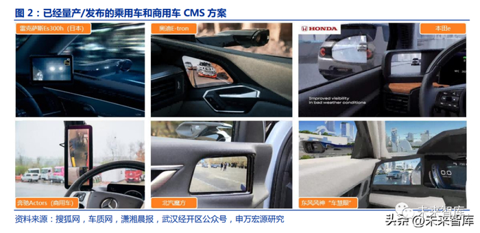 从 2016 年全球第一个 CMS 法规欧洲 ECE R46 标准发布以来,全球已经有 7 款搭载 CMS 的车量产。2018 年日本丰田雷克萨斯发布的 Es300h 搭载了 CMS,左右外后视镜摄像头采集到的画面显示在 2 个独立的 5 英寸显示屏上。奥迪 E-tron、北汽魔方、吉利路特 斯 ELETRE 等车型都将 CMS 显示屏设置在门护板上。本田 e 电动车则将 CMS 摄像头画面 显示在仪表台两侧的 6 英寸显示屏上,东风汽车“车慧眼”CMS 也是显示在仪表台两侧。从 2023 年 7 月 1 日起,小鹏 G7、北汽魔方、智己 LS7、东风风神 M57(小型 SUV)、 S73、M18(猛士科技,电动越野车)都陆续搭载 CMS。