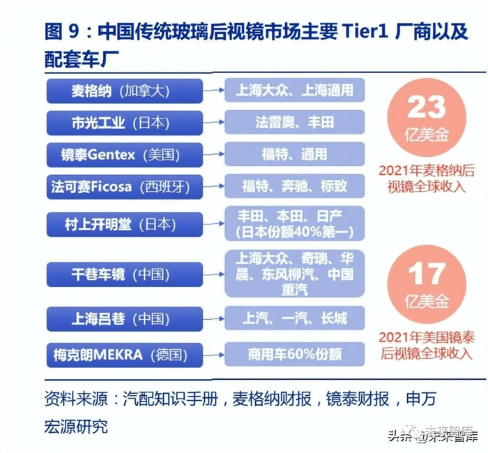 全球乘用车传统后视镜主要厂商有麦格纳、法可赛、SMR、镜泰、开明堂、市光等公 司;商用车后视镜市场,德国梅克朗拿下了 60%份额。全球汽车后视镜市占率:麦格纳 (30-40%)、西班牙法可赛 Ficosa(约 20%)、德国涉福耐克 SMR(约 20%)、美国 镜泰 Gentex(内后视镜约 34%市占率)、日本村上开明堂(日本 40%份额)、日本市光 工业。2021 年麦格纳汽车后视镜全球收入为 23 亿美元,是全球最大的汽车后视镜厂商;美国镜泰收入为 17 亿美元。美国镜泰 2020 年共出货 2610 万台内后视镜、1210 万台外 后视镜,2020 年总计生产 3820 万套汽车后视镜,对应汽车产品收入约 107.54 亿元人民 币。根据 IHS 数据,2020 年全球轻型车销量为 7650 万辆,以此计算美国镜泰在全球轻型 车内后视镜的市场的市占率约为 34%,在全球轻型车外后视镜的市占率为 8%。