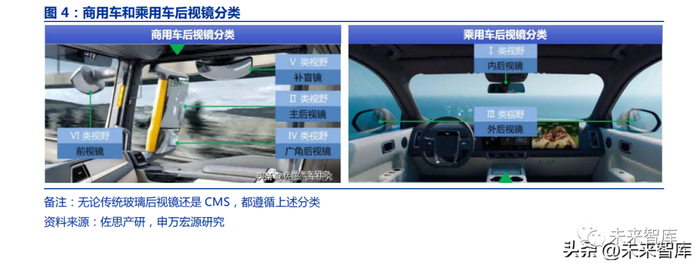 商用车和乘用车后视镜分类有所不同,商用车数量更多更复杂。无论是传统的玻璃后 视镜还是 CMS,按照乘用车标准规定,内后视镜是一类镜,外后视镜是三类镜;商用车标 准规定,二类镜是主后视镜、四类镜是广角后视镜、五类镜是补盲镜、六类镜是前视镜(看 前车头下方),装在卡车的不同方向。