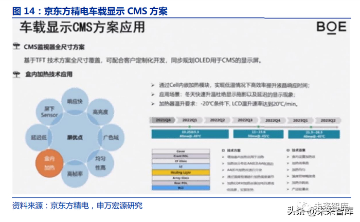 上游-面板:京东方精电2019 年就开始和北汽魔方合作,已经推出针对 CMS 的 TFT 方案,目前正在规划基于 OLED 的 CMS 方案。2019 年京东方精电和北汽魔 方合作了 CMS,提供基于 TFT 的 CMS 显示屏方案;未来在商用车卡车 10 寸和 12 寸也可 以配合客户定制化开发;另外公司还在规划基于 OLED 的 CMS 方案。CMS 显示屏的痛点 在于液晶屏在低温下的延迟和脱影,京东方精电采取了盒内加热技术在液晶层和玻璃基板 中加一个加热层,可以实现低温情况下快速提升解决上述 CMS 显示屏的痛点。