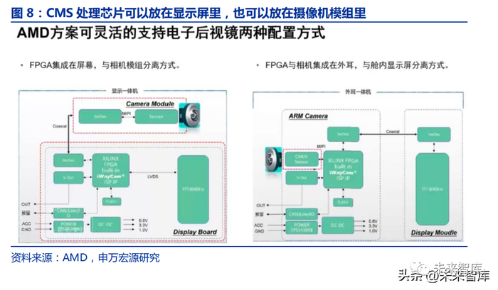 2、处理芯片 MPU 与相机集成在外耳,与舱内显示屏分离:做耳镜也就是摄像头的供 应商,他们希望把处理器嵌入到两侧耳镜当中,来适配舱内不同屏的厂家。这种方案可以 使得整个系统小型化,在外耳镜端器件可以用小的封装在长条形或者半圆形的两侧耳镜模 块当中。摄像头采集到的 Raw data 传输进来可以在耳镜端直接做 ISP 处理,然后在舱内 显示屏中做显示。