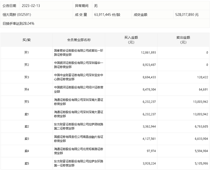 2月13日,恒大高新今日涨5.45%,龙虎榜数据显示,上榜营业部席位全天成交9399.45万元,占当日总成交金额比例为17.8%。其中,买入金额为5670.71万元,卖出金额为3728.75万元,合计净买入1941.96万元。