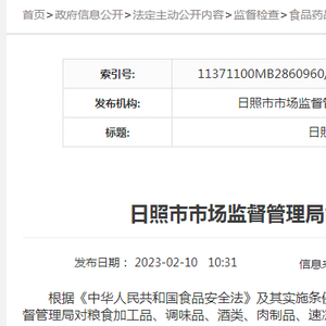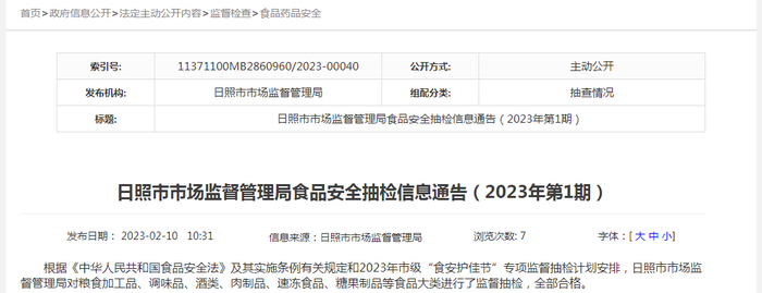山东省日照市市场监督管理局发布2023年第1期食品安全抽检信息