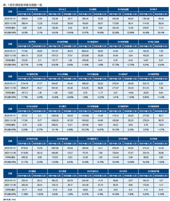 Wind数据显示,申万一级行业中,2023年1月北向资金持股市值环比增长额居前的行业是电力设备、食品饮料、非银金融、有色金属。