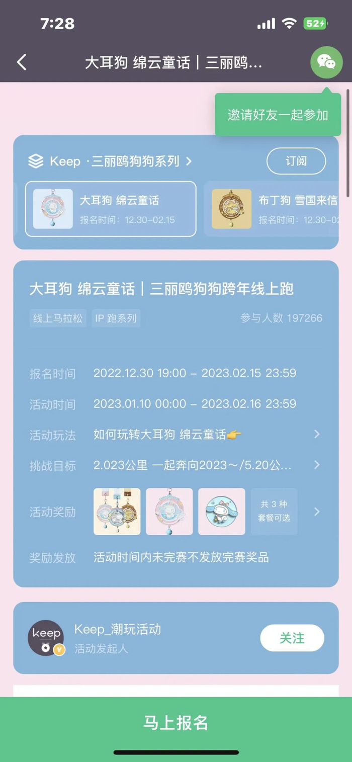 三丽鸥系列是Keep奖牌的绝对人气王。蓝鲸记者浏览Keep相关板块2月活动发现,其他IP联名的参与人数在2万人左右,而三丽鸥系列参与人数高达20万。