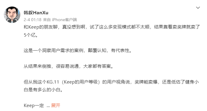 近日,博主韩叙在微博上表示,“和Keep的朋友聊,真没想到啊,试了这么多变现模式都不太顺,结果靠着卖奖牌就卖了5个亿。”