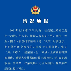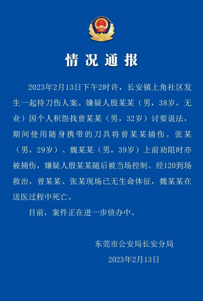 2023年2月13日下午2时许,长安镇上角社区发生一起持刀伤人案。嫌疑人殷某某(男,38岁,无业) 因个人积怨找曾某某 (男,32岁) 讨要说法,期间使用随身携带的刀具将曾某某捅伤。张某(男,29岁) 、魏某某 (男,39岁) 上前劝阻时亦被捅伤,嫌疑人殷某某随后被当场控制。经120到场救治,曾某某、张某现场已无生命体征,魏某某在送医过程中死亡。