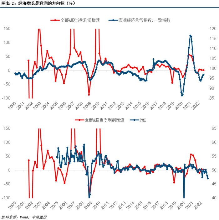 利润趋势决定股指走势,而决定利润方向的是经济增长形势。经济增长是以不变价核算的,因此实际上是“量”的含义。在价格不过大幅度波动下,经济周期向上,则意味着产出的量增加,企业的利润改善,经济周期向下,则意味着产出的量减少,企业的利润走弱。回溯我国历史数据,宏观经济景气指数、PMI等经济增长指标与企业利润增速的走势一致性较高,经济的拐点基本上也是利润的拐点。