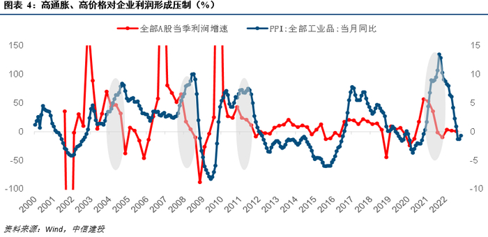 二是,“价”进入高增长阶段后,整体利润往往受到压制走弱。如2004年、2008年、2011年、2021年几次通胀大幅上行的后半段,高通胀、高价格并不意味着企业高利润,相反企业利润收到明显压制走弱,原因还是A股企业并非均处于上游,制造业、中下游占比高。