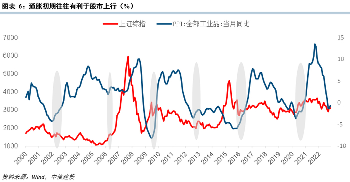 通胀初期往往有利于股市上行。通胀触底回升后,企业利润加速改善,股票市场在利润的带动下,也开始改善。但随着通胀进一步上行,利润和市场的动能开始走弱。