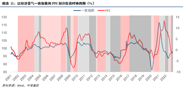 从美林投资时钟出发,也可以得到相似结论。美林时钟按美国GDP增速和通胀趋势将经济状态划分为衰退(经济下行、通胀下行)、复苏(经济上行、通胀下行)、过热(经济上行、通胀上行)、滞胀(经济下行、通胀上行)四个周期,对应最好的资产类别选择分别为债券、股票、商品、现金。将美林时钟应用到我国来看,由于我国2012年后GDP波动较小,因此经济增长方面我们选用宏观经济景气一致指数和中国综合PMI指标替代,其波动范围相对更大一些;通胀方面由于我国CPI更多受猪周期扰动,CPI周期并不完全反应需求端冷热,且我国是工业大国,因此用PPI指标替代。将我国2002年以来的处于同一周期的所有月份数据汇总,计算各类资产月收益的算数平均值,结果是符合美林时钟的,复苏期股票月均收益4.0%(四类资产中收益排第一),过热期商品月均收益1.5%(排第一),滞胀期现金月均收益0.2%(与债券并列第一),衰退期债券月均收益0.7%(排第一);从期间累计收益看,虽并非每个阶段都完全符合,但胜率表现仍是符合美林时钟的。2023年上半年,经济向上,通胀筑底,属于复苏时钟期,因此股票资产表现将占优。下半年,剔除基数影响后的经济预期延续改善,通胀处于回升初期,属于过热时钟期,理论上权益资产不占优,但实际上这是从整个周期来看的,如果仅看过热期的早期,权益资产仍有较好表现,这与我们关注增长拐点和通胀初期的意义是一致的。