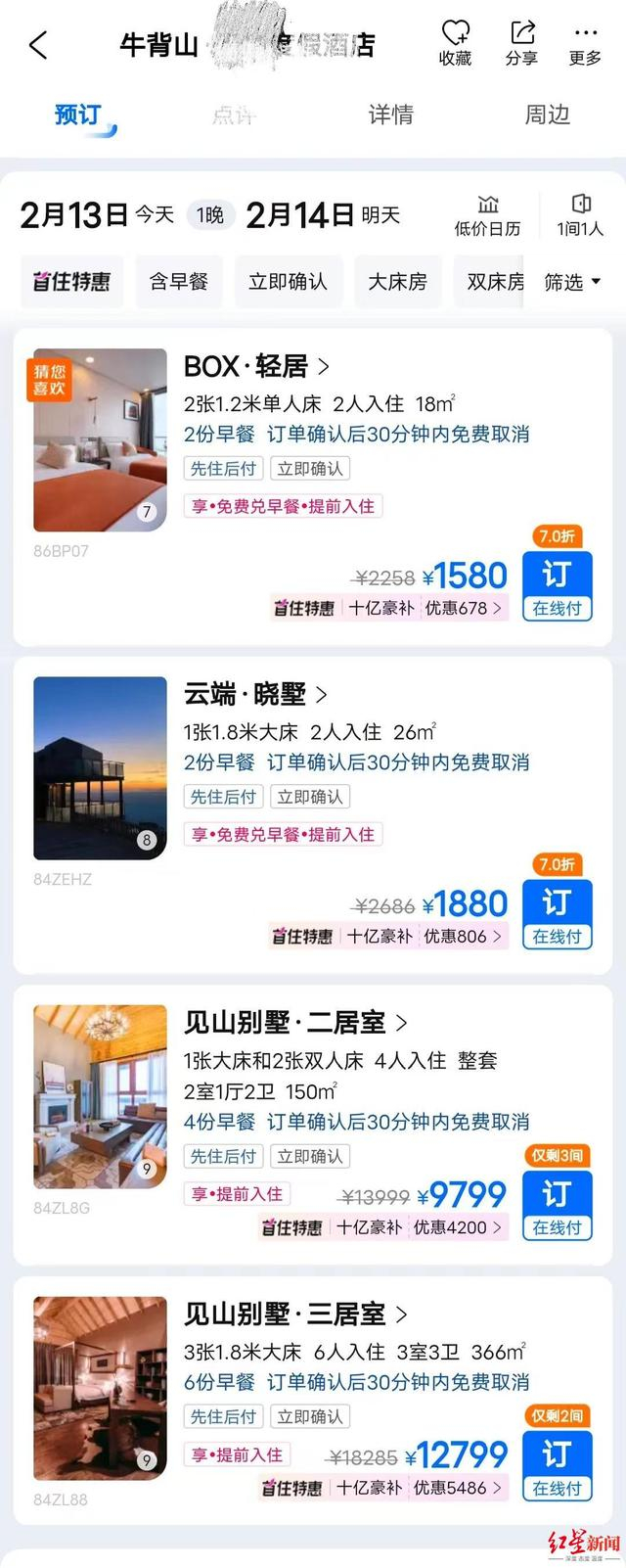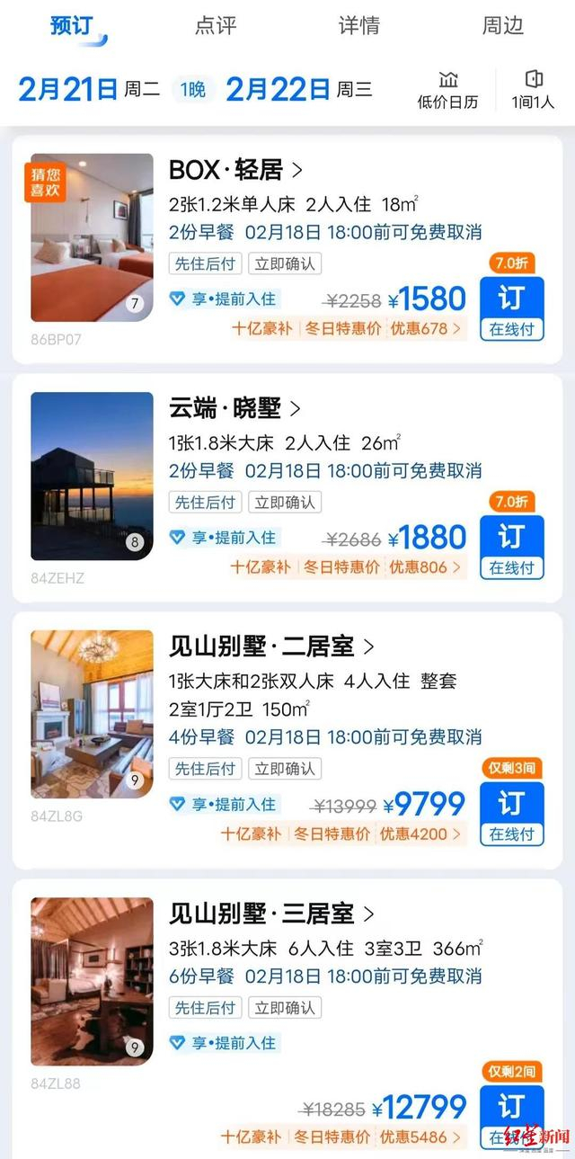 2月13日,红星新闻分别以2月13日(周一)、21日(周二)至14日(周二)、22日(周三)通过携程网查看了牛背山顶的住宿价格,发现最便宜的帐篷营地价格为820元/晚,最贵的为距离牛背山200米的牛背山某酒店见山别墅(三居室),也就是工作人员口中的“大木屋”,价格为12799元/晚,而工作人员口中的6980元/晚起的“小木屋”则是该酒店的见山别墅(二居室),也并非6980元/晚,而是9799元/晚。