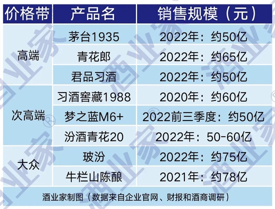 酒业家梳理发现:截至目前,能够稳居百亿阵营的白酒企业仅有贵州茅台、五粮液、洋河股份、泸州老窖、剑南春、山西汾酒、郎酒、习酒、古井贡酒等十余家,而能够突破百亿的大单品则更为稀缺,在持续霸榜的飞天茅台、五粮液普五外,仅有剑南春水晶剑、国窖1573、洋河海之蓝等少数百亿级超级大单品。