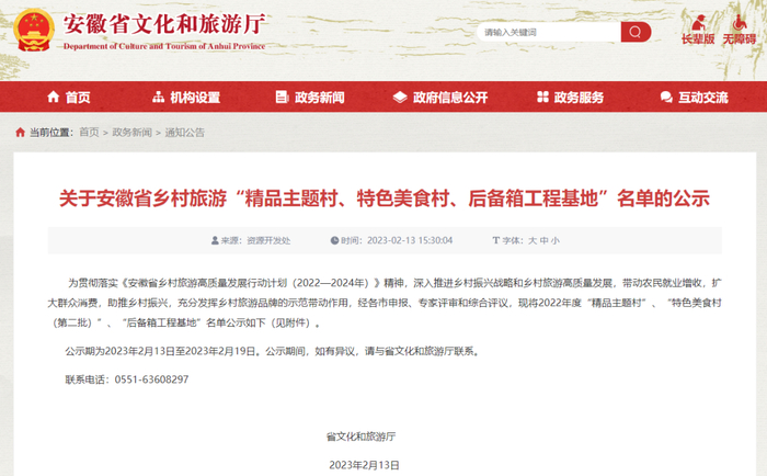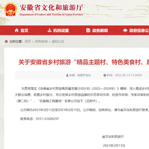2月13日,安徽省文化和旅游厅网站发布信息,对2022年度“精品主题村”、“特色美食村(第二批)”、“后备箱工程基地”名单进行公示,其中合肥多地入选