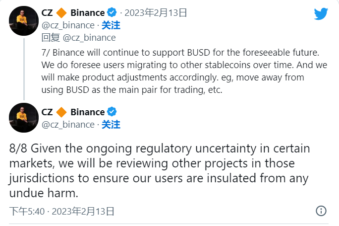 当天,币安首席执行官赵长鹏在推特表示,已从加密货币公司Paxos获悉,他们被纽约州金融服务部命令停止发行新的BUSD。在可预见的未来,币安将继续支持其与美元挂钩的稳定币BUSD。