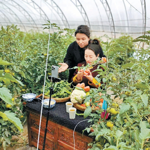 次仁曲珍(左)在蔬菜大棚里做直播。
