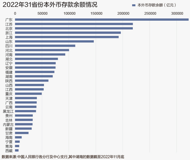 2022年末,中国经济第一大省广东一枝独秀,本外币存款余额突破30万亿,达到32.24万亿元,也是全国唯一一个突破30万亿的省份。而GDP排名第二的省份江苏,存款数据为21.87万亿,位列全国第二。