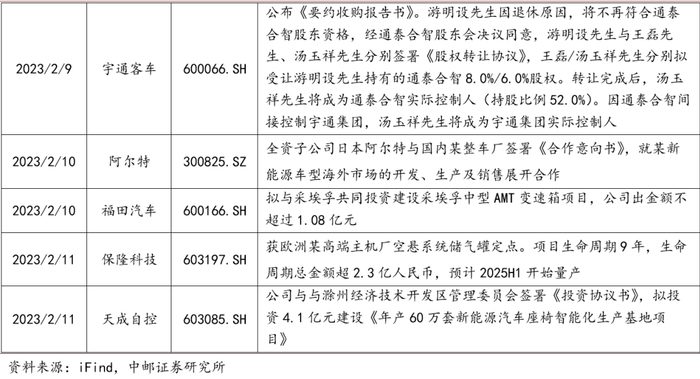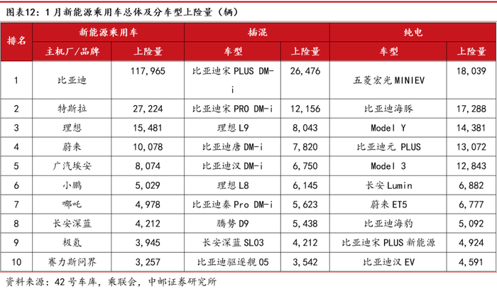新能源乘用车方面,长安、比亚迪、理想、特斯拉中国1月销量表现领先行业:1月,长安自主新能源销量2.8万辆,同/环比分别+106.1%/-38.0%;比亚迪新能源乘用车销量15.0万辆,同/环比分别61.6%/-36.0%;理想汽车销量1.5万辆,同/环比分别+23.4%/-27.8%;特斯拉中国销量6.6万辆,同/环比分别+10.4%/+18.4%。