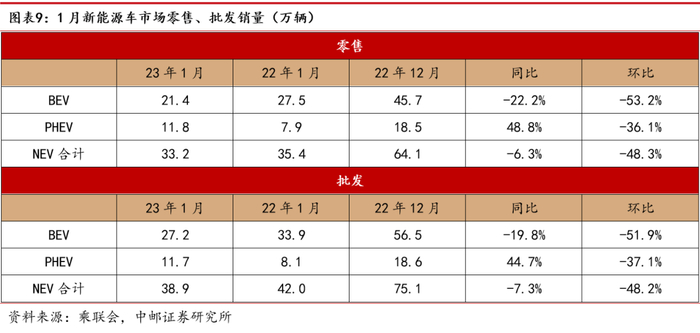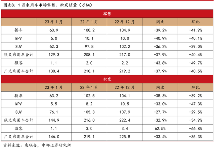 1月国内市场狭义乘用车零售销量129.4万辆,同/环比分别-37.9%/-40.4%,批发销量144.9万辆,同/环比分别-32.9%/-34.9%;同期新能源车零售销量33.2万辆,同/环比分别-6.3%/-48.3%,批发销量38.9万辆,同/环比分别-7.3%/-48.2%。