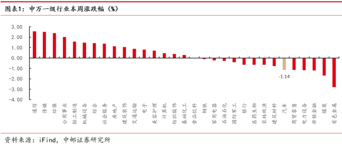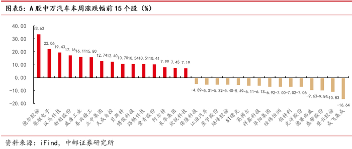 本周申万汽车板块涨幅前五个股依次为德尔股份(+33.63%)、奥联电子(+22.06%)、汉马科技(+19.43%)、新朋股份(+17.16%)、威唐工业(+16.11%);跌幅前五个股依次为成飞集成(-16.64%)、登云股份(-10.83%)、盛帮股份(-9.84%)、德赛西威(-9.63%)、光洋股份(-7.06%)。
