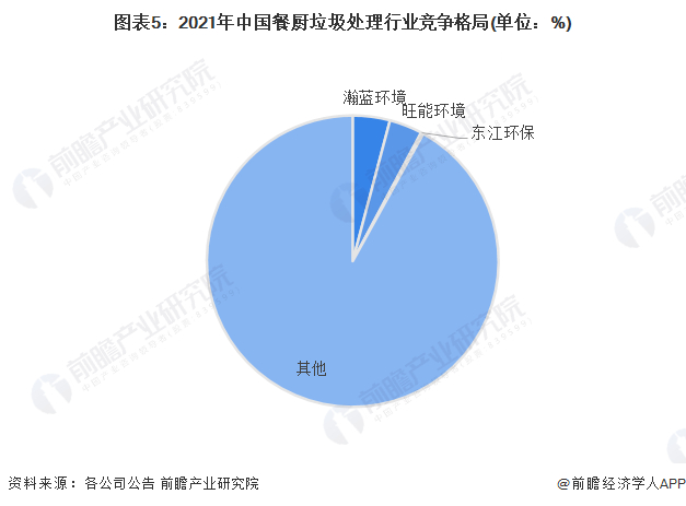 从中国餐厨垃圾处理行业竞争格局来看,2021年,瀚蓝环境餐厨垃圾处理能力为3069吨/日,占餐厨垃圾总处理规模的4.13%,旺能环境餐厨垃圾处理能力为2720吨/日,占比3.66%。总体来看,餐厨垃圾处理市场集中度较低。