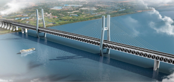 崇启公铁长江大桥是沪渝蓉高速铁路全线重点控制性工程,是目前世界上在建跨度最大的公铁两用无砟轨道斜拉桥。大桥全长4.09公里,横跨长江北支,是江苏启东与上海崇明的主要连接通道。其构造为双层布置的公铁两用桥,桥面采用2线高铁+2线城际+6车道一级公路布置,是主跨400m双塔双索面钢桁结合梁斜拉桥。