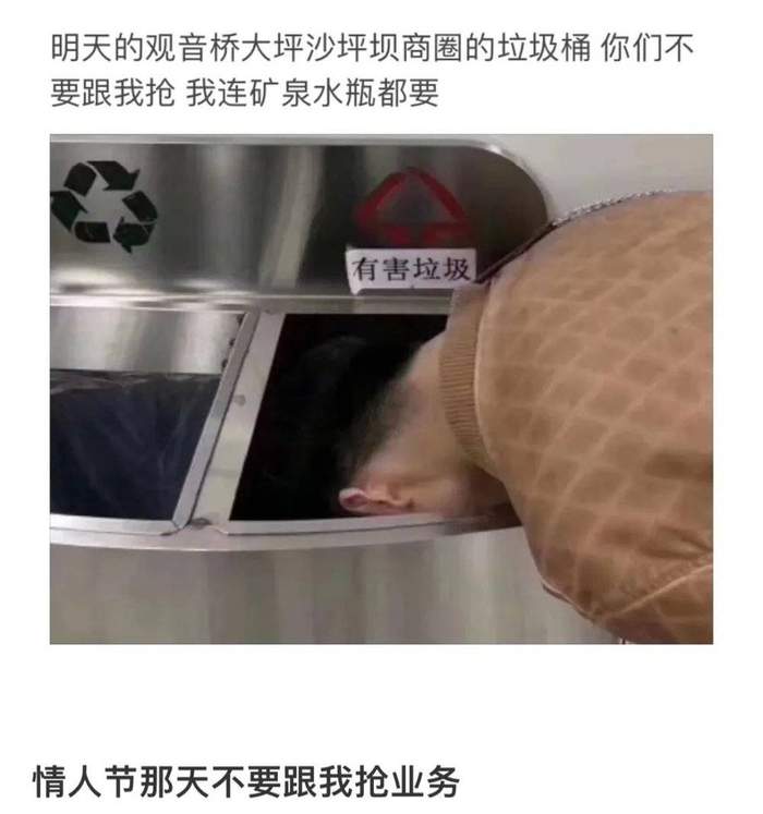 甚至或许还会有这样的景象出现:街上情侣寥寥,只有单身人士空守垃圾箱。