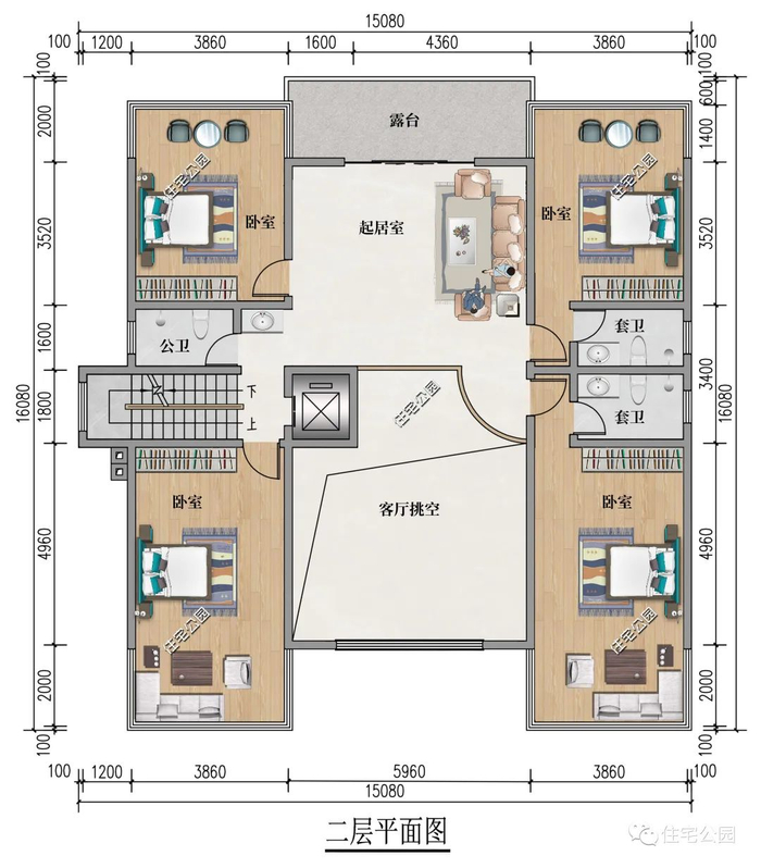 二层主要是家人的居住区,设有4间卧室,面积都很宽敞,居住舒适度也不差。