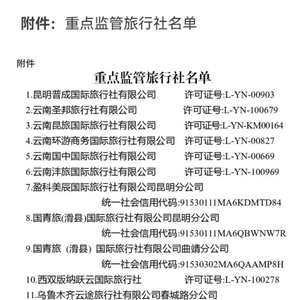近日,云南省文化和旅游厅发布通知,决定将全省2023年1月投诉量排名靠前的19家旅行社列入全省重点监管名单,这些旅行社的注册地址包括了昆明、大理、丽江、西双版纳等热门旅游目的地。同时请属地文化和旅游部门对重点监管名单所列旅行社进行约谈整改,列入州市红黑榜的“黑榜”。