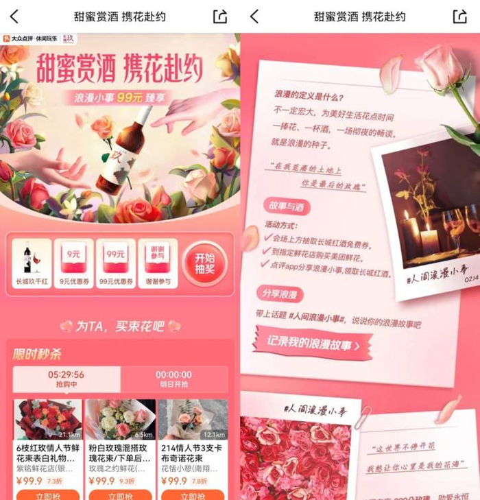 为了助力更多实体花店把握消费旺季,推动生意加速回暖。美团休闲玩乐频道在情人节前夕联合线下鲜花实体小店推出情人节折扣促销和99.9元热卖鲜花团购,同时,线下超千家酒吧加入到主题活动中,推出浪漫的情人节优惠套餐,让消费者可以全方位享受情人节限定的浪漫氛围。